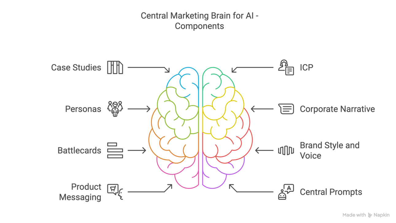 In that brain: central assets (e.g. personas, messaging, battlecards, brand style and voice, product messaging, central prompts) that change the game by giving clear directions and parameters to the tools.
