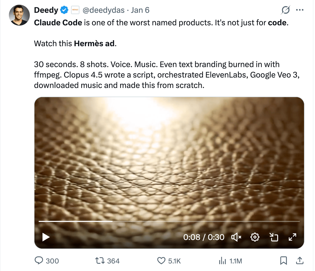 I wanted to see if Claude Code could truly create a video like the Hermes one above. Here is the video that Claude Code created for me while I while watching a documentary on Netflix (Becoming Led Zeppelin!).