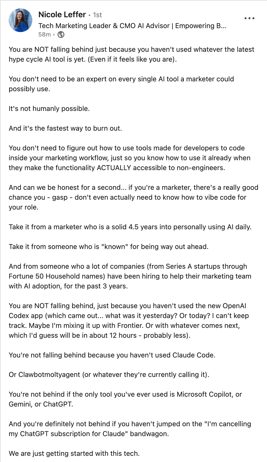 Nicole is going to strike a chord with her post (below, too), because so many will see it as a great stress and FOMO reliever. Indeed, keeping up with AI advancements puts a lot of pressure on all of us. It's exhausting if you're trying to try every new tool that seems relevant for you (my backlog just got longer in the last four days only), when so many get overhyped by influencers.
