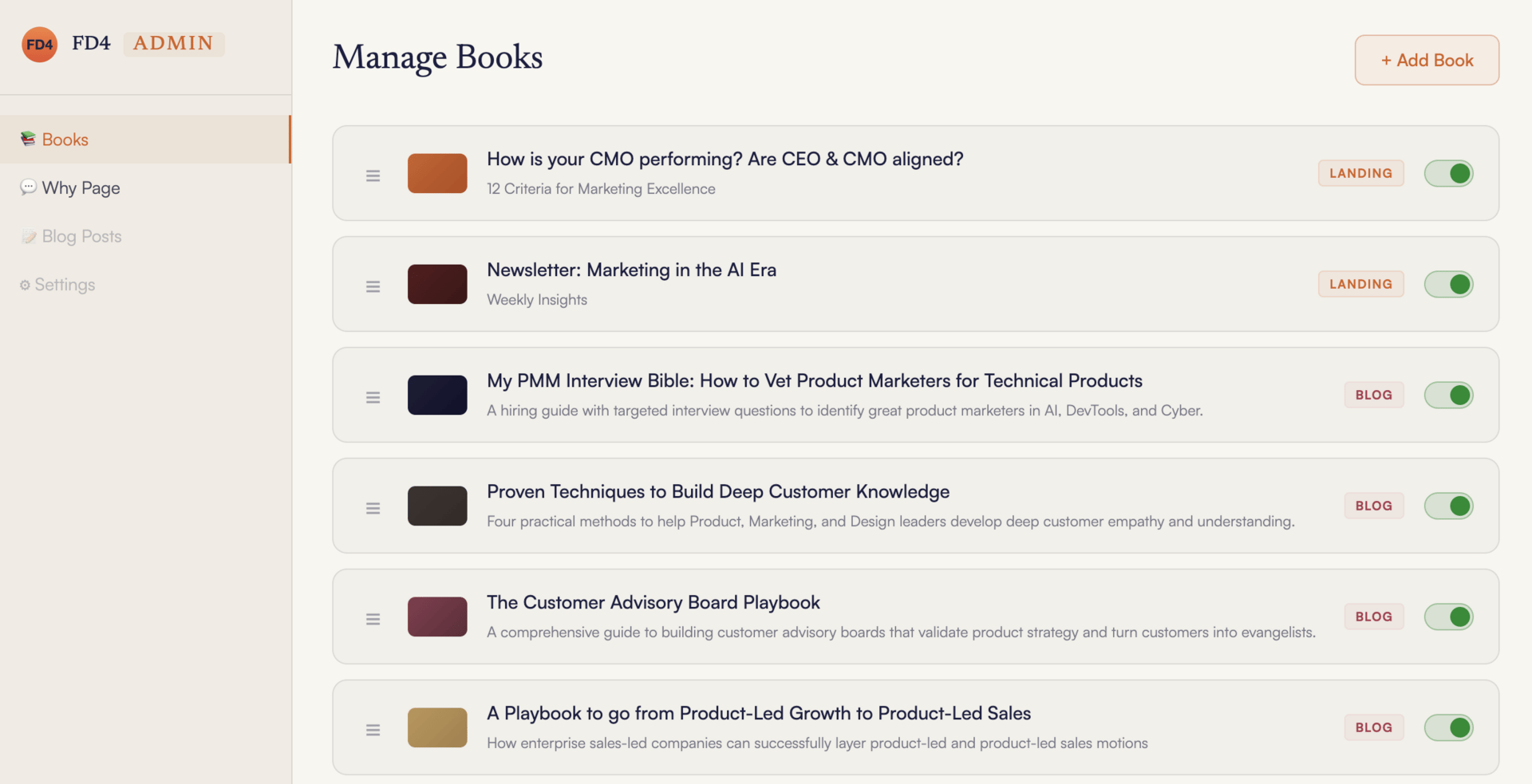 I also built my admin console. It helps me import my previous articles and content from LinkedIn and Decibel using a scraper and the Claude API. There, I can edit my content, pick the color and texture for the new “books”, reorganize them, etc.